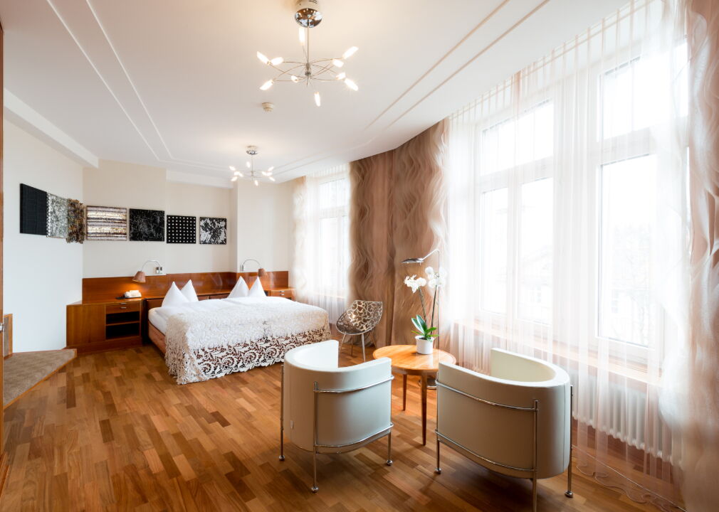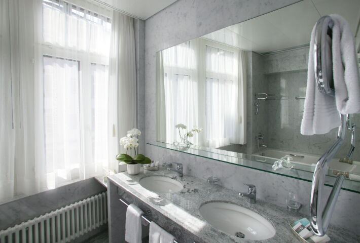 Toutes les chambres de l’hôtel Einstein rendent hommage au passé textile de la Suisse orientale avec de magnifiques tissus. C’est avec une grande fierté que nous vous présentons cette Junior Suite dont les textiles ont été réalisés en exclusivité par la grande maison Saint-Galloise Jakob Schlaepfer.